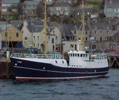 | At Stromness, the intrepid travellers and kit made for John Thornton's boat "Karin", ( Shown Right ) a converted fishing vessel which sleeps 14, although 10 makes for more room. Kit stowed and bunks sorted, it was time to investigate the local. The next morning, unusually a sunny one, it was off to visit UMS Hampshire, mined during WW1 and a 60 M dive. On the way the cylinders were filled with trimix and all was ready. Unfortunately the shot line missed the wreck and a 63 m seabed was just the same as a 30 M one. Dive aborted but the experience was good, as weights could be sorted out and back up plans tested! Our 'techi' diver hung at 6 m watching all the leaks from A clamps, first stages and direct feeds in order to drum up business for his service centre back on the boat! Back to shore to make further investigations of the local. | ![]() |